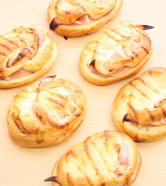 北海道産のゆめちからブレンドを使用したふんわり、モチモチの生地にスライスハムを巻き込んだ定番の惣菜パンです。ハムが全体に入る可愛らしい成形で、お好みでマヨネーズをかけて焼きます。焼き上がりの香りがとても良いパンです。