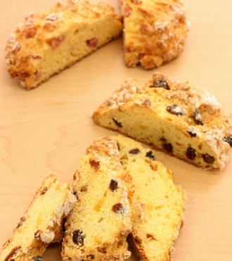 パン酵母の代わりに重曹を使い、発酵時間無しで作るクイックブレッドです。お味は2種類、チーズとベーコン、レーズンとオレンジピール。