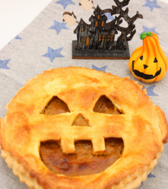 カボチャのお化け、ジャック・オ・ランタンを真似て、顔のパーツをくり抜いた生地を被せて、見た目も華やかで美味しいパイに仕上げます!