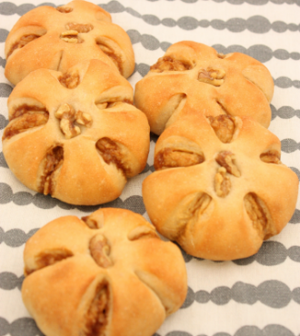 トッピングにくるみを乗せて食感のアクセントにしています。朝食や小腹が空いた時のおやつ代わりに食べていただけるパンです。