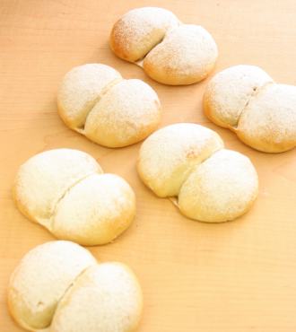 良質なたんぱく質と大豆イソフラボンなど、女性に優しい豆乳を仕込み水に使った白パンです。バターなどの油分は入れませんが、しっとりもちもちに仕上がります。定番の白パンの成形で小ぶりに6個作ります。